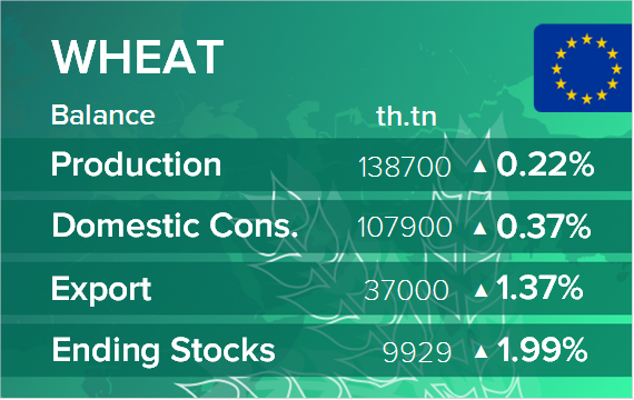 Производство пшеницы в Европейском союзе оценивается в 138,70 млн метрических тонн, что на 0,30 млн тонн больше, чем ожидалось в прошлом месяце, и на 11,77 млн тонн больше, чем было произведено в предыдущем году. Уборочная площадь оценивается в 24,10 млн га, по сравнению с 24,05 млн га в прошлом месяце, что более чем на 1,00 млн га больше, чем в предыдущем году. Урожайность при этом повышена с 5,75 тонны с гектара в прошлом месяце до 5,76 т/га. Прогноз экспорта пшеницы из ЕС в 2021/22 году повышен на 500 тыс. тонн до 37,0 млн тонн за счет увеличения прогноза производства и конкурентоспособного ценообразования.
