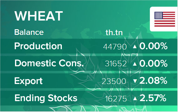 Прогноз на 2021/22 год для американской пшеницы в этом месяце заключается в небольшом снижении запасов, неизменном внутреннем потреблении, сокращении экспорта и увеличении конечных остатков. Запасы снижены из-за сокращения импорта при более слабых, чем ожидалось, темпах поставок Hard Red Spring (HRS). Экспорт снижен на 20 миллионов бушелей до 840 миллионов из-за замедления экспортных продаж и поставок для сортов Hard Red Winter и HRS. Кроме того, ожидается, что экспортные цены в США останутся высокими до конца 2021/22 года, что еще больше снизит конкурентоспособность США.