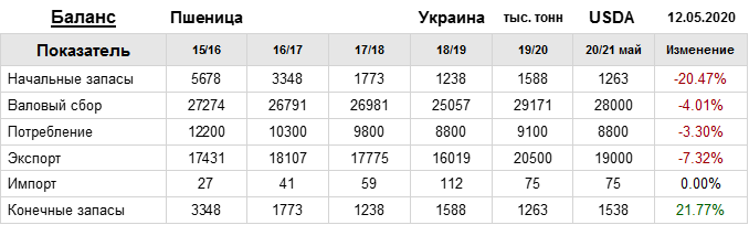USDA. Баланс по пшенице на 14.05.2020. Украина