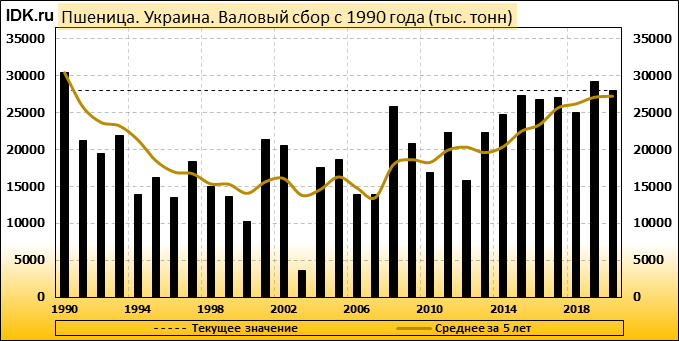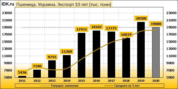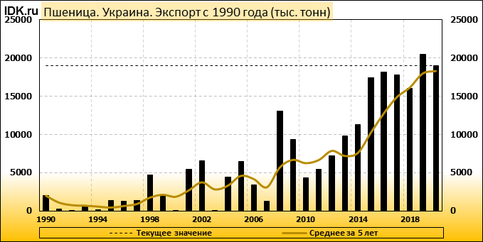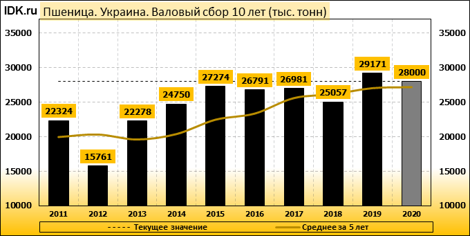 Министерство сельского хозяйства США прогнозирует, что производство пшеницы в Украине в 2020/21 году составит 28,0 млн. метрических тонн, что на 1,17 млн. тонн или 4 процента ниже, чем в предыдущем году. Уборочная площадь оценивается в 6,75 млн. га, что на 0,27 млн. га или 4 процента ниже прошлогоднего показателя. Согласно прогнозу, урожайность составит 4,15 тонны с гектара, что немного меньше, чем в прошлом году. Ожидается, что экспорт пшеницы из Украины снизится на 1,5 млн. тонн до 19 млн. тонн из-за уменьшения производства и экспортных ограничений в связи с пандемией COVID-19.