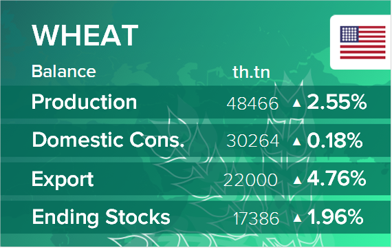 Прогноз для рынка пшеницы в США на 2022/23 год в этом месяце заключается в увеличении запасов, внутреннего потребления, экспорта, а также в увеличении конечных остатков. Запасы повышены за счет увеличения производства, при этом производство прогнозируется на уровне 48,47 миллионов тонн, что на 1,2 миллиона тонн больше, чем ожидалось в прошлом месяце. Прогноз остатков на конец 2022/23 года увеличен на 0,33 миллиона тонн до 17,39 миллиона тонн, что все еще на 3,2 процента меньше, чем в 2021/22 году.