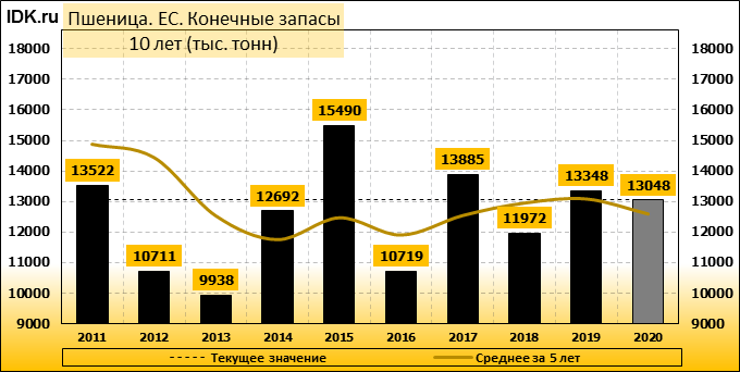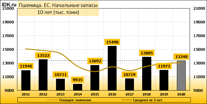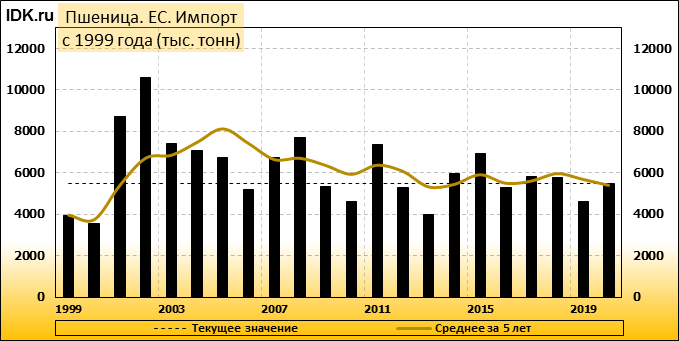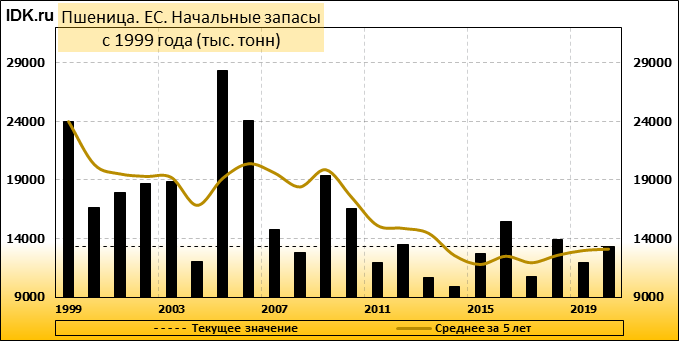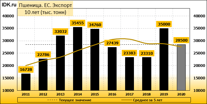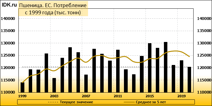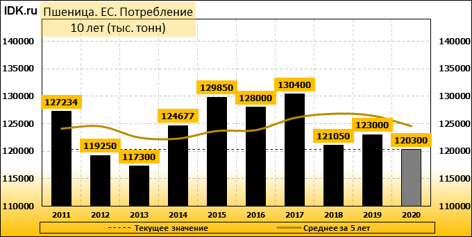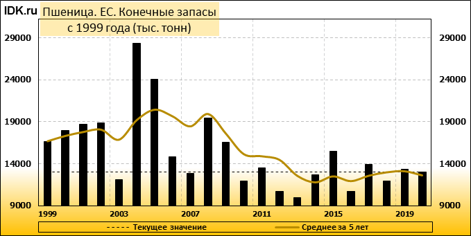 Министерство сельского хозяйства США прогнозирует производство пшеницы в Европейском союзе (включая Великобританию) в 2020/21 году на уровне 143,0 млн. метрических тонн, что на 11,8 млн. тонн или 8 процентов ниже, чем в прошлом году, и на 4 процента ниже среднего показателя за 5 лет. Уборочная площадь оценивается в 25,3 млн. га, что на 0,8 млн. га или 3 процента ниже прошлогоднего показателя и на 4 процента ниже среднего показателя за 5 лет. Согласно прогнозу, урожайность составит 5,66 тонны с гектара, что на 5 процентов меньше, чем в прошлом году. Уборочная площадь оценивается как самая низкая с 2007/08 года. Чрезвычайно сложные условия посева прошлой осенью в Великобритании, Франции и других странах северо-запада ЕС являются основной причиной сокращения посевной площади.