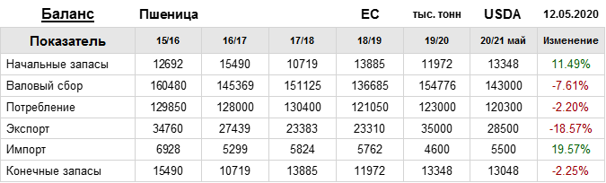 USDA. Баланс по пшенице на 14 мая 2020. ЕС