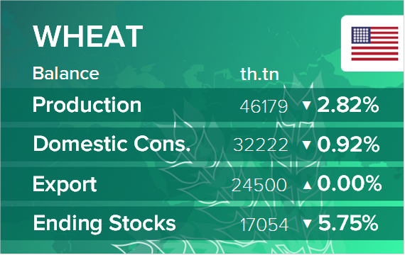 Прогноз на 2021/22 год для американского рынка пшеницы в этом месяце заключается в сокращении запасов, снижении внутреннего потребления, неизменном экспорте и уменьшении конечных остатков. Отчет NASS по производству сельскохозяйственных культур прогнозирует производство всей пшеницы на уровне 1 697 миллионов бушелей, что на 49 миллионов меньше предыдущего прогноза. Большая часть сокращения приходится на Hard Red Winter и Soft White Winter. Экспорт пшеницы не изменился, но внесены компенсирующие изменения экспорта по отдельным классам пшеницы. Прогнозируемые конечные остатки на 2021/22 год сокращены на 38 миллионов бушелей до 627 миллионов, что на 26 процентов ниже прошлогоднего уровня.