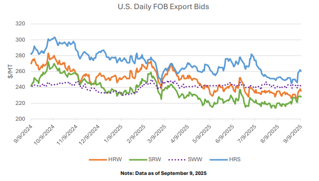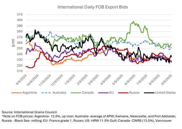 Внутренний рынок: После августовского обвала цены на пшеницу в США выросли после многомесячных минимумов на фоне сильных экспортных продаж и относительно слабого доллара США. Цена на твердую краснозерную озимую пшеницу подскочила на 9 долларов за тонну до 261 доллара, в то время как мягкая краснозёрная озимая пшеница подорожала на 8 долларов за тонну до 228 долларов. Цены на мягкую белую озимую пшеницу (242 доллара за тонну) и твердую красную яровую пшеницу (235 долларов за тонну) практически не изменились по сравнению с прошлым месяцем.