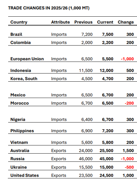 Рис 3. Изменения в торговле в 2025/26 году (1000 тонн) Источник: USDA