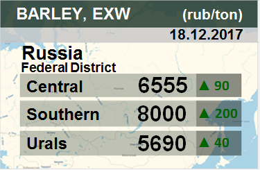 Ячмень. Цены EXW. Россия. Данные на 18.12.2017