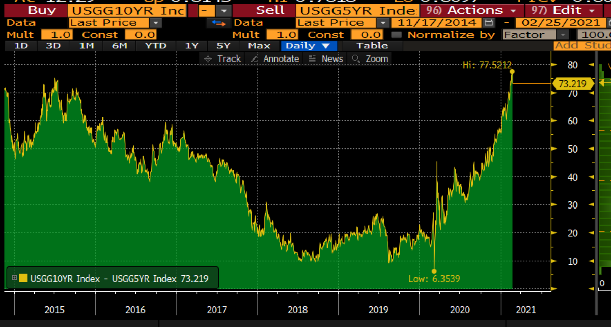 Доходность 10-летних казначейских облигаций является самой высокой с 2014 года по сравнению с 5-летними ставками.