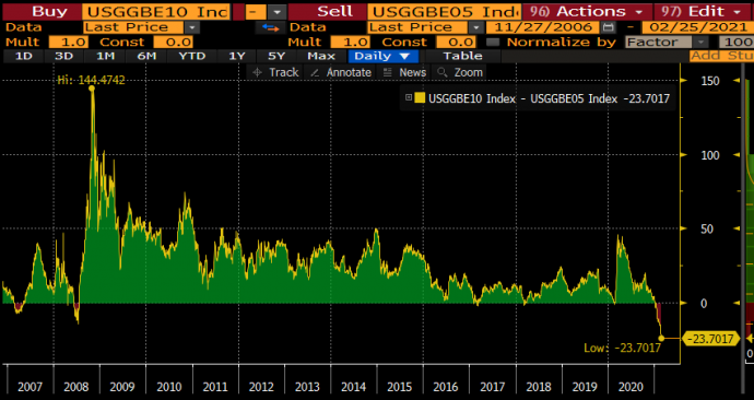 Трейдеры на рынке долга явно делают ставку на то, что в краткосрочной перспективе инфляция в США вырастет, а в долгосрочной перспективе — снизится. Пятилетняя инфляция впервые с 2008 года превысила 10-летнюю.