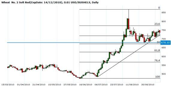 Пшеница поставки ноября впервые за рассматриваемый период достигла отметки 236 евро за тонну 5 августа, а уже 18 августа упала в цене до 198 евро за метрическую тонну. В течение недели после этого контракт торговался в пределах 2 евро ниже уровня сопротивления.
