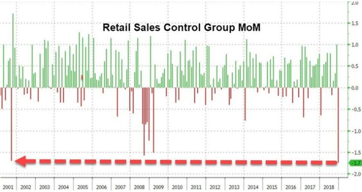 Накануне вышли данные по розничным продажам, которые можно смело назвать катастрофическими. Розничные продажи относительно декабря провалились на 1,2% (прогноз: +0,1%). В рамках «контрольной группы» (без учета бензина, автомобилей и строительных материалов) показатель упал на 1,7%.