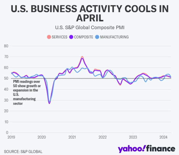 Сводный индекс деловой активности (PMI) в США от S&P Global, который отражает активность как в секторе услуг, так и в производственном секторе, составил 50,9 в апреле, что является самым низким показателем за четыре месяца. Данные за апрель снизились с 52,1 пункта, зафиксированных в марте, и оказались ниже ожиданий экономистов на уровне 52 пунктов.