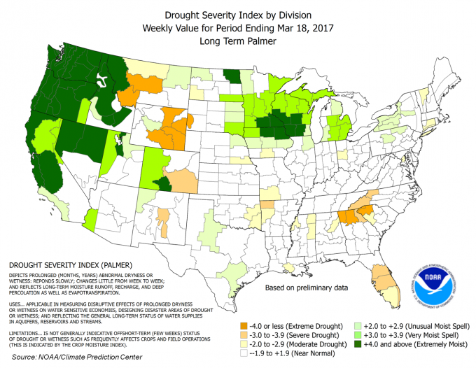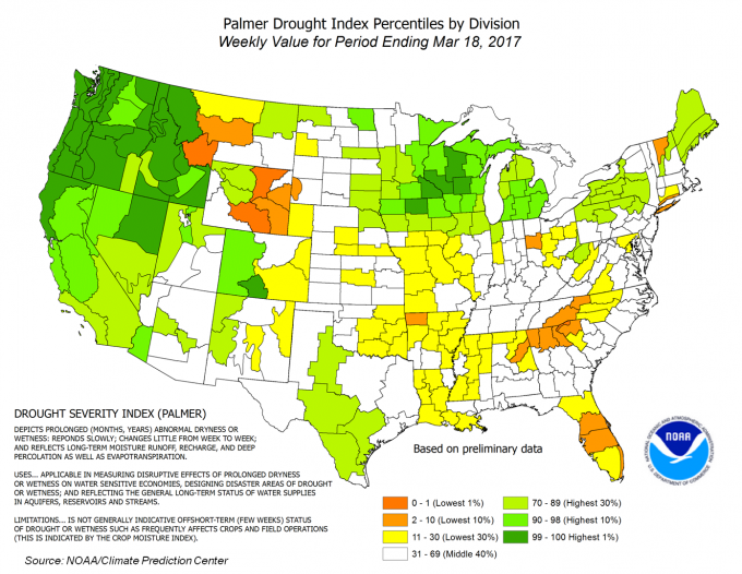 Согласно индексу суровости засухи Палмера, южная Миннесота, северная Айова и юго-западный Висконсин имеют самый высокий уровень насыщения почвы влагой. Эти районы являются крупнейшими производителями кукурузы и сои в стране.