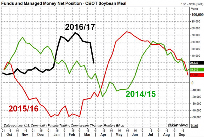 Длинная позиция по сое на бирже CBOT сокращается шестую неделю подряд и в настоящее время достигла минимума с весны 2016 года. Длинные контракты по масличным сократились до 37 916 контрактов с 65669 неделей ранее, и новая чистая позиция включает 78 407 коротких позиций, наибольшее число с середины марта 2016 года.