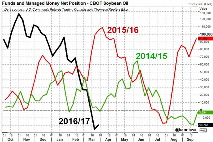 Между тем, фонды слегка сбавили медвежий настрой на соевое масло до 19748 коротких контрактов с 25 165 на предыдущей неделе. Это существенное изменение для растительного масла, которое в прошлом месяце сбросило позиции на 50 000 контрактов в течение двух недель.