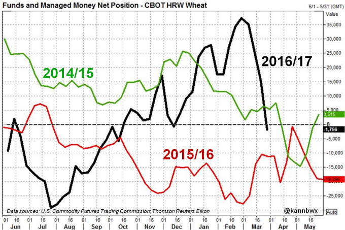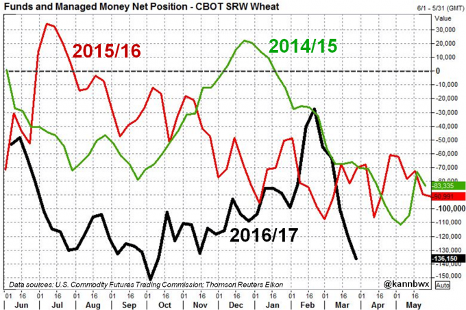 Как и в случае с кукурузой, фонды придерживаются самой пессимистичной позиции в отношении soft red wheat с начала октября 2016 года. В настоящее время чистая короткая позиция составляет 136 150 контрактов, что представляет собой скромное сокращение в 15 145 контрактов за неделю.