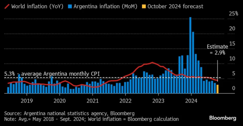 Президент Аргентины Хавьер Милей, вероятно, получит приятные новости из отчета по потребительским ценам за октябрь. Месячная инфляция, возможно, замедлилась до трехлетнего минимума чуть менее 3%, а годовой показатель составил менее 200%, что ниже апрельского пика в 289,4%.