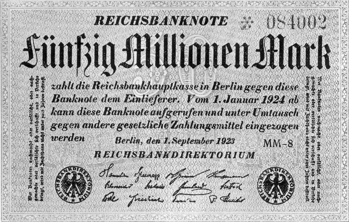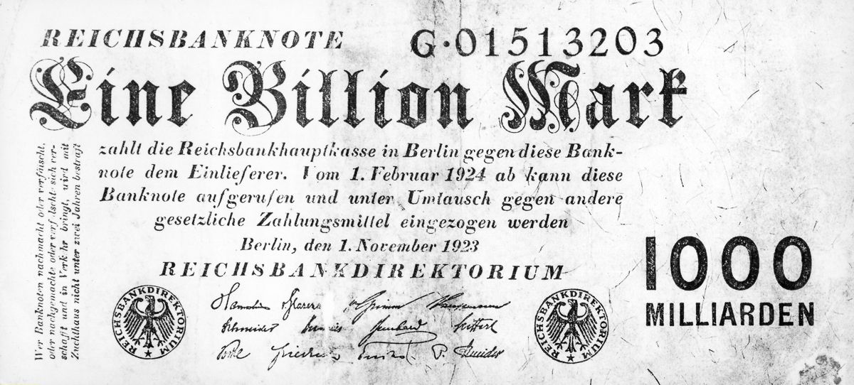 Во время гиперинфляции в Германии 1920-х годов национальная валюта, марка, сошла с ума. Правительство Веймарской республики могло погасить свои долги, но это произошло за счёт сбережений граждан. Это эпоха, которая до сих пор остаётся частью национального сознания.