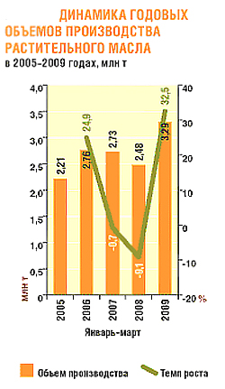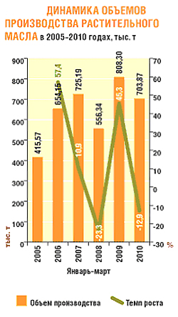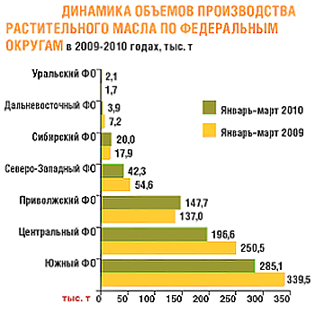 По данным исследования маркетингового агентства ROIF Expert, I квартал 2010 года был отмечен сокращением объема производства растительного масла в Российской Федерации — по результатам данного периода, объем произведенной продукции составил 703,9 тыс. тонн, что говорит о снижении на 13% по сравнению с аналогичным показателем прошлого года.