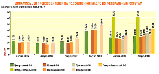 Наиболее высокие цены производителей на подсолнечное масло, по состоянию на август 2010 года, наблюдались в Северо-Западном федеральном округе, где стоимость 1 тонны составила 61,3 тыс. рублей. Самый низкий уровень цен на подсолнечное масло в этот период был зафиксирован в Южном федеральном округе, где стоимость 1 тонны составила 28,4 тыс. рублей.