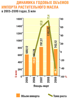 В натуральном выражении, по итогам 2008 года, импорт вырос на 19,3%, до 1116,15 тыс. тонн, а в 2009 году он уже снизился на 33,6% и составил 740,89 тыс. тонн. Такая динамика является следствием соответственно увеличения и снижения физических объемов ввозимого растительного масла. При этом за I квартал текущего года рост объемов импорта в стоимостном выражении оказался более существенным, чем в физическом, что характеризуется увеличением цен на импортную продукцию.