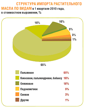 В I квартале 2010 года наибольшая доля в структуре импорта — 65% в стоимостном выражении — принадлежала пальмовому маслу.
