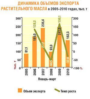 В период с 2006 года по 2009 год экспорт растительных масел показывает тенденцию противоположную импорту. Такой резонанс в динамике за 2008-2010 годы вызван снижением производства этой продукции внутри страны. Так, по итогам января-марта 2008 года, выпуск растительных масел сократился, что повлекло за собой уменьшение экспорта на 60,5%. В 2009 году за аналогичный период производство выросло на 45,3%, что в свою очередь позволило увеличить экспортные поставки на 159,1%. Начало текущего года охарактеризовалось снижением объема производства на 12,9% при растущем спросе, в итоге экспорт снизился на 32,6%.