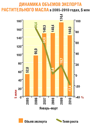 За I квартал 2010 года размер экспорта растительного масла составил $ 144 млн, при этом наблюдалось снижение данного показателя по отношению к аналогичному периоду прошлого года — на 17,4%.