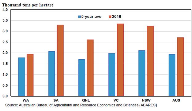 Рисунок 2. Урожайность пшеницы в восточных штатах Австралии в 2016 году значительно превысила среднюю