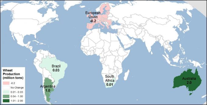 Дополнительную информацию об изменениях производства пшеницы в этом месяце см. на карте ниже. Цветом обозначены изменения по сравнению с прогнозом предыдущего месяца в млн. т.