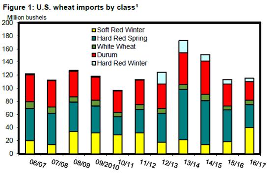 Данные Бюро переписи США, доступные в настоящее время по январь 2017 года, указывают на медленный темп поставок из Канады, отчасти из-за низкого качества. В результате произошло сокращение импорта в США для большинства классов пшеницы, включая Hard Red Winter, Hard Red Spring, Durum и White Wheat. После суммарного сокращения в 10 млн. бушелей совокупный импорт пшеницы в США на 2016/17 г. прогнозируется на уровне 115 млн. бушелей.