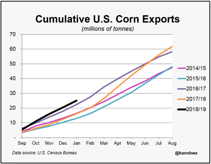 Экспорт кукурузы из США был очень активным с тех пор, как примерно год назад урожай конкурирующей Аргентины сократился на 22 процента по сравнению с предыдущим годом из-за засухи. Неблагоприятная погода также сократила общий урожай кукурузы в Бразилии на 17 процентов.