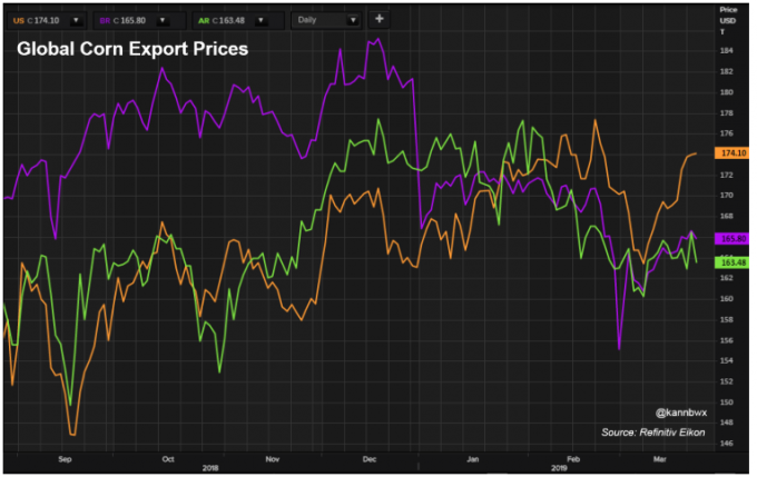 Экспортные цены на кукурузу в США в настоящее время выше, чем в Бразилии или Аргентине, и из-за недавнего наводнения, вызвавшего логистические трудности, транспортные расходы не обязательно сделают продукцию США более привлекательной.