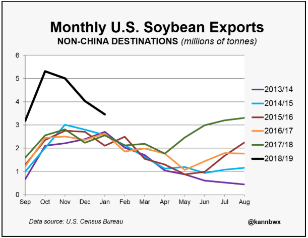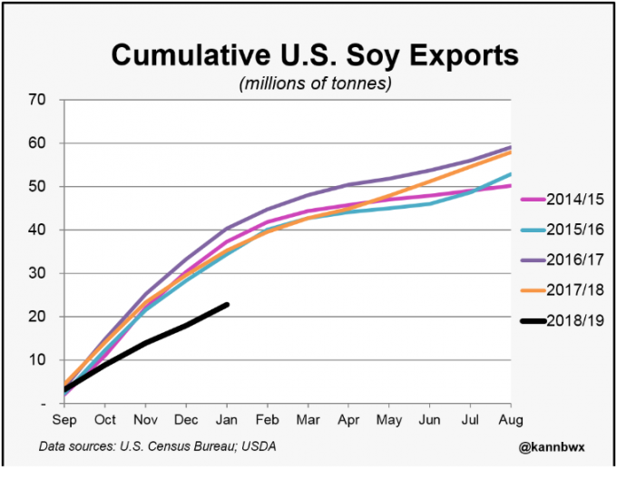 Торговая война между США и Китаем отразилась на экспорте сои из США. По состоянию на конец января экспорт в 2018-19 году составлял всего 22,8 миллиона тонн, что на 35 процентов ниже по сравнению с тем же периодом прошлого года и является самым низким объемом для этого периода с 2011-12 года.