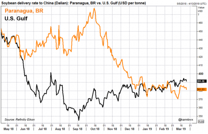 Американские соевые бобы также будут конкурировать с южноамериканскими поставками в течение следующих нескольких месяцев, и прогноз здесь еще более осложняется тем фактом, что Соединенным Штатам еще предстоит разрешить торговый спор с Китаем, основным покупателем сои.
