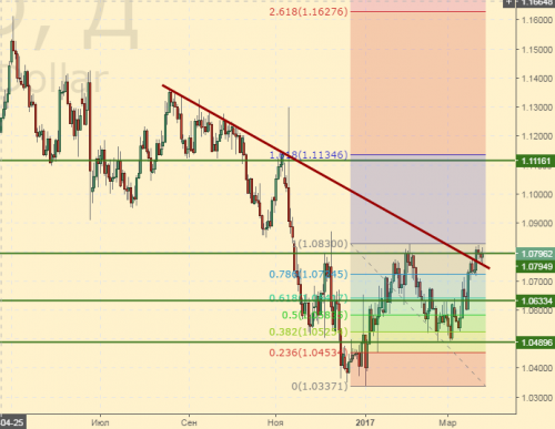 Сценарий роста: продолжаем мы расти, что очень радует, на самом деле. Если пройдем 1.0820, то цели на 1.1100 станут очень реальными. Уровень 1.0794 продолжает обозначать район сопротивления. И… и мы рассчитываем, что он будет взят быками. Если с текущих уровней будет откат к 1.0650, то там, в глубине, можно купить.