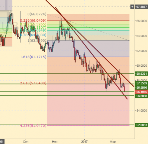 Продажа: если нефть не будет падать и будет достигнут уровень 58.00. Стоп: 58.20. Цель: 52.00.