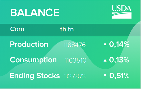 Прогноз производства кукурузы на 2019/20 год снижен на 45,4 млн. бушелей за счет сокращения уборочной площади и предполагаемой урожайности. Снижение запасов в значительной степени компенсируется сокращением потребления кукурузы для производства этанола на 50 млн. бушелей до 4 900 млн. бушелей в этом маркетинговом году. Снижение потребления кукурузы на продовольствие, семена и промышленность на 50 млн. бушелей приводит к прогнозируемому потреблению в 2019/20 г. на уровне 13 780 млн. бушелей. Начальные остатки 2020/21 года повышены на 4,6 млн. бушелей. Было внесено несколько других незначительных изменений в балансах кормового зерна, цены не изменились с прошлого месяца.