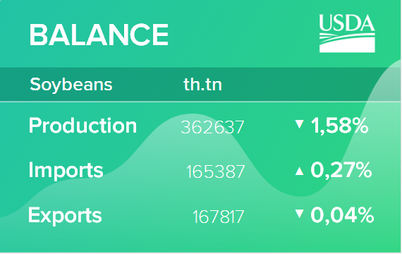 В ноябрьском отчете Министерства сельского хозяйства США об урожае прогноз урожайности сои на 2020/21 год снижается до 50,7 бушелей с акра с 51,9 бушелей в прошлом месяце. При неизменной оценке уборочной площади в США снижение урожайности сокращает прогноз производства сои в 2020/21 году в этом месяце на 98 миллионов бушелей до 4,17 миллиарда. Снижение урожая сои почти полностью ответственно за сокращение прогнозируемых остатков на конец сезона на 100 миллионов бушелей до 190 миллионов. Сильное рыночное ралли этой осенью отражается повышением прогноза Министерства сельского хозяйства США средней фермерской цены на 2020/21 год в США до 10,40 доллара за бушель с 9,80 доллара в прошлом месяце.