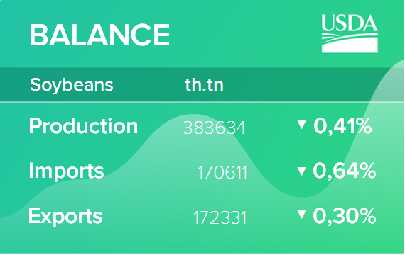 Отчет Национальной службы сельскохозяйственной статистики о производстве сельскохозяйственных культур в этом месяце прогнозирует урожайность сои в США, основанную на первом в сезоне исследовании, на уровне 50,0 бушелей с акра, по сравнению с трендовой урожайностью 50,8 бушелей с акра в прошлом месяце. Как следствие, прогноз производства на 2021/22 год (4,34 миллиарда) снижен на 66 миллионов бушелей по сравнению с предыдущим месяцем. Продолжающаяся засуха и ограниченное количество осадков в Миннесоте и Дакотах способствуют снижению урожайности ниже трендового уровня.