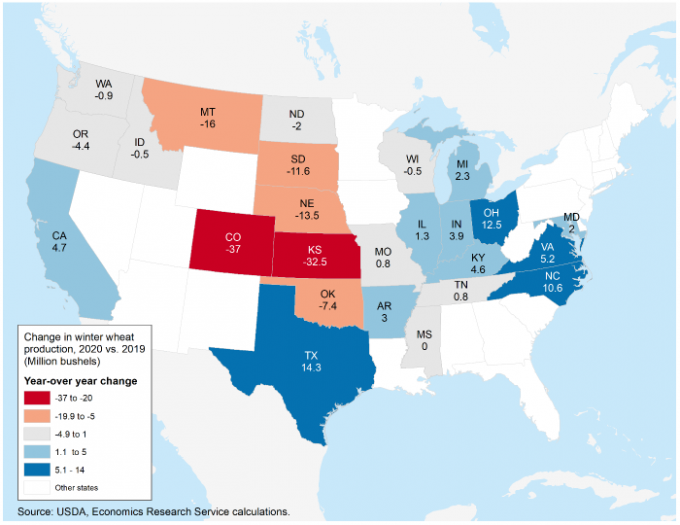 o Основываясь на данных опросов, Статистическая Служба Министерства сельского хозяйства США (NASS) прогнозирует производство озимой пшеницы на уровне 1 255 млн. бушелей, что на 4% меньше, чем в 2019 году, на фоне более низкой урожайности и небольшого сокращения уборочной площади.
