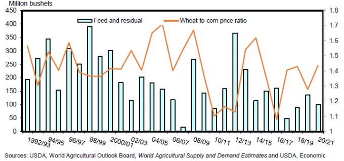 Рисунок 3. Кормовое и остаточное потребление в США сокращается в связи с более высоким соотношением цен на пшеницу и кукурузу.