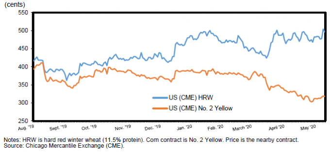 Ожидания уменьшения урожая пшеницы оказывают понижающее давление на оценку кормового и остаточного потребления. Тем не менее, прогнозируемые рекордные запасы кукурузы и относительно низкие цены на кукурузу, что выражается в очень высоком соотношении цен на пшеницу и кукурузу, в значительной степени означает, что кукуруза вытеснит пшеницу в кормовых рационах. С августа 2019 года по март 2020 года средняя разница между ближайшими фьючерсными контрактами на пшеницу и кукурузу составляла около 0,55 долл. США за бушель (рис. 4). После марта 2020 года, когда вступили в силу широкомасштабные меры по сдерживанию распространения COVID-19 в США, и по 11 мая 2020 года средняя разница между этими двумя контрактами составляла в среднем 1,34 доллара США, что явно отражает значительные рыночные изменения для этих двух зерновых культур.