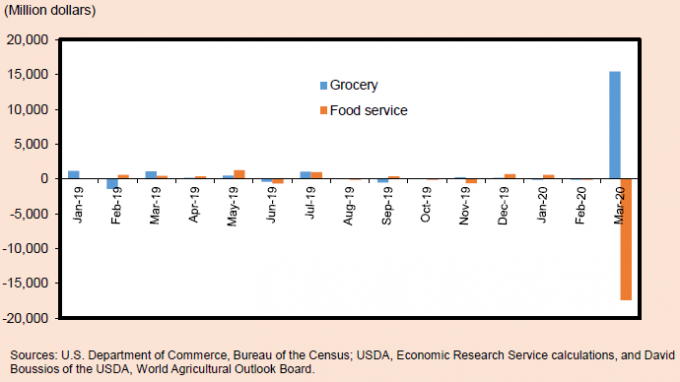 С 2004 года потребители тратили больше денег на еду вне дома (общественное питание), чем на еду дома, при этом доля расходов на еду достигла максимума в 2017 году, составив 53 процента от общего объема. Ввиду того, что с появлением COVID-19 возможности общественного питания внезапно стали очень ограниченными, потребители быстро переориентировали свои покупки на розничные / продуктовые магазины. Согласно данным Бюро переписи США, потребительские расходы в продуктовых магазинах в марте выросли на 27 процентов по сравнению с февральскими расходами и на 30 процентов по сравнению с прошлым годом. Напротив, потребительские расходы на еду вне дома сократились на 27 процентов по сравнению с предыдущим месяцем и на 23 процента по сравнению с годом ранее. Несмотря на то, что в результате мер по замедлению распространения COVID-19 модели покупательского поведения явно изменились, менее очевидным является влияние на продовольственное потребление пшеницы. Ключевой вопрос заключается в том, компенсирует ли растущий потребительский спрос на пшеницу и пшеничные продукты в продуктовых магазинах потерянный спрос на общественное питание.