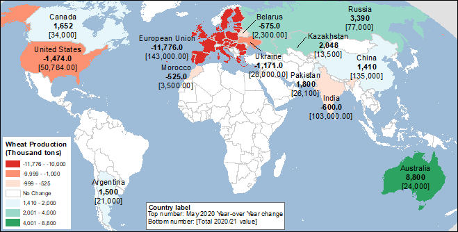 Если запасы Китая и Индии вычесть из общего глобального объема, объем переходящих остатков для остального мира возрастет незначительно (+1,97 млн. метрических тонн) в 2020/21 году до 122,7 млн. Прогнозируется, что несколько крупных стран-экспортеров, таких как Канада, Украина, Россия, Аргентина и Австралия, незначительно увеличат свои остатки, в основном благодаря расширению производства.