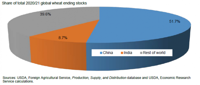 Рисунок 7. На Китай и Индию в совокупности приходится более 60% мировых остатков пшеницы 2020/21 года.