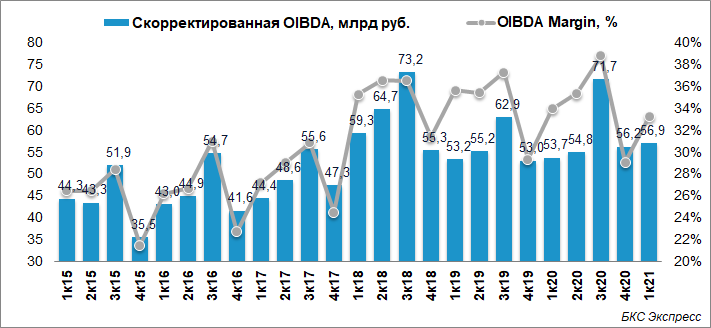 Скорректированная OIBDA выросла на 6,1% г/г до 56,9 млрд руб. преимущественно на фоне повышения скорректированной OIBDA дочерних компаний: