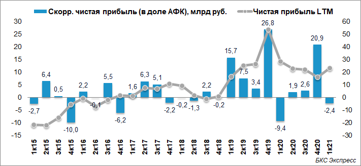 Сокращение скорректированного чистого убытка г/г преимущественно связано с ростом операционной прибыли и эффектом значительного убытка от курсовых разниц в I квартале 2020 г.