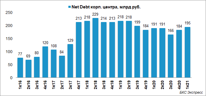 Показатель чистый долг корпоративного центра на конец I квартала 2021 г. составил 195 млрд руб. (+2,3% г/г; +6,2% кв/кв).