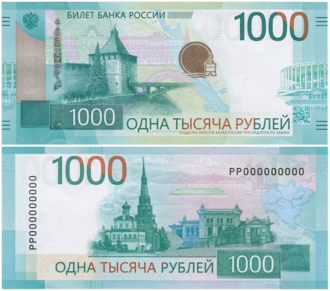 Тысячерублевая банкнота при этом посвящена Нижнему Новгороду и Приволжскому федеральному округу. Основное изображение лицевой стороны — Никольская башня Нижегородского кремля, на оборотной стороне отображены Музей истории государственности татарского народа и Республики Татарстан в Казани, башня Сююмбике на территории Казанского кремля, Музей археологии и этнографии в Уфе.